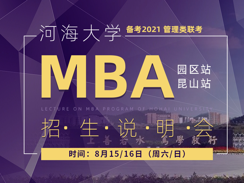 河海大学成立于1915年,是一所拥有百余年办学历史,多学科协调发展的教育部直属全国重点大学,是实施国家“211工程”重点建设、国家优势学科创新平台建设、一流学科建设以及设立研究生院的高校。学校在南京市、常州市设有西康路校区、江宁校区和常州校区,占地面积2462亩。 河海大学商学院是江苏省内同时拥有工商管理博士点和博士后流动站的两所院校之一。2015年率先完成AMBA国际认证,是江苏省唯 一通过AMBA再认证的MBA项目。教育部最 新一轮的学科评估当中,工商管理学科位列全国前20%,江苏省第二位。MBA项目按培养方式分为全日制和非全日制,其中,非全日制按特色分为海纳百川MBA和上善若水MBA。